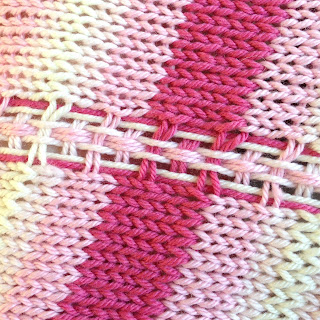 I weaved into my dropped stitches 8 strands of yarn - 1 dark pink, 1 white, 1 medium pink, 2 medium pink, 1 medium pink, 1 white, 1 dark pink. You can see the pattern below.